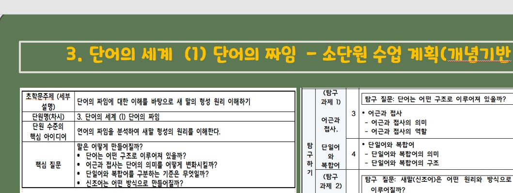 (수정) 3. 단어의 세계 (1) 단어의 짜임-개념기반교육과정의 틀에 담은 소단원 수업계획 (형태소, 어근, 접사, 단일어, 복합어, 새말 만들기) 전국단위 카톡방에서 한 선생님께 이 파일 드릴까요 말씀드렸는데 갑자기 많은 선생님들이 자료 요청을 하셨습니다.이거 단단히 잘못 건드렸구나, 일일이 보내드릴 시간이 도저히 안 되는데 어쩌지? 잠시 고민하다가여기에 올리면 되겠구나 싶어서 얼른 올립니다.2학기 계획이라 8월에 2학기 전체 자료를 공개하려고 했는데 일단 이것부터 올립니다혹시 2학기의 다른 자료도 보고 싶으시면 이 게시판(중학교 1학년 국어수업)에 있으니 찾아보시기 바랍니다^^올해 너무 심하게 바빠서 블로그 관리가 엉망이네요그래도 8월 중순까지는(어쩌면 그보다 일찍) 2학기 단원계획표 모두 올리겠습니다^^참, 개념기반교육과정 틀 말고 일반 틀에 담은 약간 다른 단원 계획도 이 게시판에 있습니다. 재작년에 수업한 것입니다. 중학교 1학년 국어수업 2025.07.10