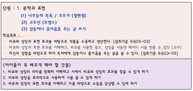 중학교 1-1 비유와 상징 수업 단원계획표입니다(2015개정교육과정-천재교육(박)) 2015개정교육과정으로 수업한 것이지만 2022 개정교육과정과 성취기준이 매우 유사합니다. 참고가 되실 것 같아 올립니다. '비유와 상징' 수업에서는 비유와 상징의 단순한 사전적 의미 파악이나 용어에 치중하는 것보다는 비유와 상징의 표현효과를 학생들이 직접 느끼고, 찾아보고, 직접 비유와 상징을 사용하여 표현해 보도록 하는 것이 성취기준의 취지에 더 맞는 수업이라고 볼 수 있습니다^^'소설 뒷이야기 쓰기' 학습지도 함께 올립니다. 단순한 '뒷이야기 쓰기'가 아니라 성취기준에 기반한 뒷이야기 쓰기여야겠죠? 그래서 여기에도 '비유와 상징'이 들어가 있습니다^^ 중학교 1학년 국어수업 2025.03.16