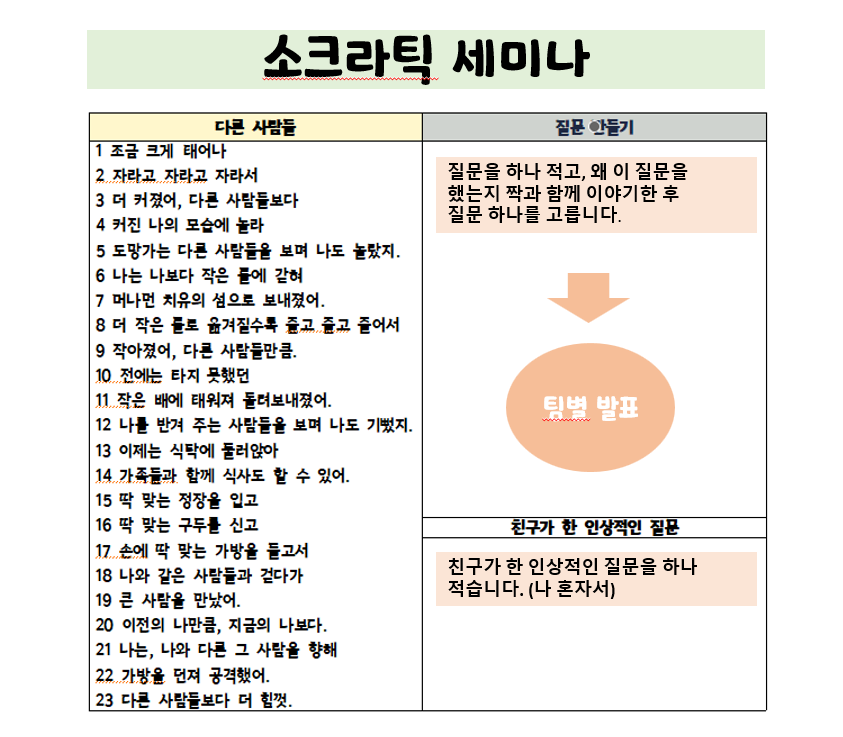 그림책을 활용한 소크라틱 세미나 작년에 했던 그림책 활용 소크라틱 세미나 수업입니다.2022 개정교육과정에서 '질문 탐구'가 매우 강조되고 있죠? 수업의 순서는 이렇습니다. (ㅁ자로 앉습니다)1. 아이들이 그림책 또는 소설을 함께 읽은 후2. 주어진 학습지에 질문을 몇 가지 씁니다.3. 교사는 학생들에게 가장 마음에 드는 질문을 하나씩 고르게 하고 이유를 묻습니다.4. 손을 들어 함께 토의할 질문 몇 개를 고릅니다.5. 교사는 가장 선택을 많이 받은 질문부터 하나씩 질문을 택하여 학생들이 그 질문에 대답하게 합니다.6. 이 모든 과정들을 빠르게 전자칠판, 컴퓨터 등에 메모합니다.* 이 때 중요한 것은 교사의 발문과 진행입니다. 이게 포인트입니다. 그러려면 수업을 준비하는 과정에서 교사의 많은 노력이 필요하겠죠?7. 질문하고 대답하고, .. 카테고리 없음 2025.03.19