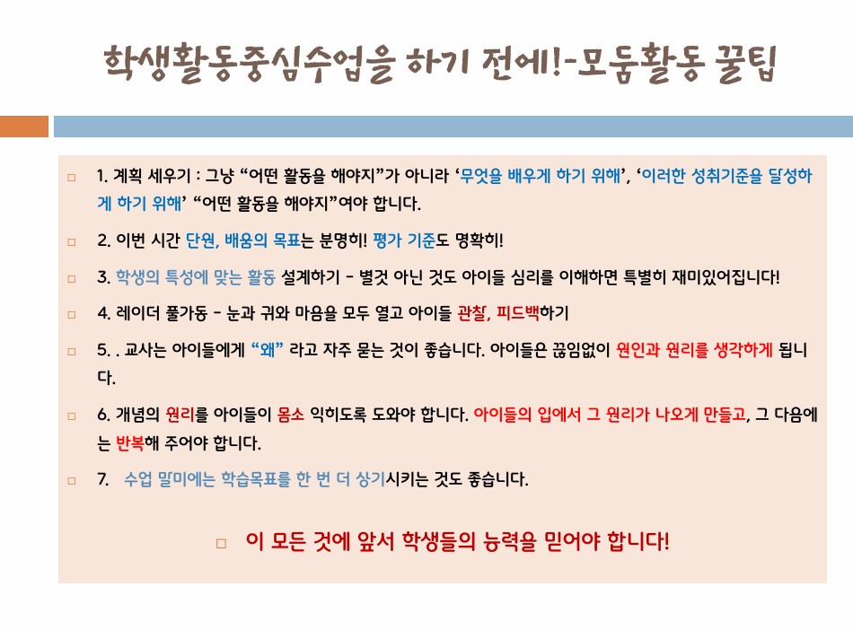 모둠활동, 좋은 건 알겠는데 잘 안 되세요? 작년에 제가 저희 학교 선생님들께 30분간 해 드렸던 '짤강' 원고입니다.저희 학교 선생님들이 제 수업을 보러 자주 오시는데, 아이들이 모둠활동을 너무나 잘하는 것을 신기해 하시기도 하고 어떻게 하면 저렇게 될까 궁금해 하시기도 해요.하루 아침에 되는 것은 아니지만, 모둠활동을 성공적으로 하는 데는 비결이 있답니다. 무엇보다 필요한 것은 아이들이 스스로 할 수 있다는 교사의 믿음, 그리고 교사의 끊임없는 피드백입니다. 그 바탕에는 아이들에 대한 사랑과 관심이 깔려 있겠죠?절대로 중간에 포기하지 마시고, 적어도 한 달 정도는 계속해 보세요. 잘 안 되는 부분은 댓글이나 카톡을 통해 말씀해 주시고요^^천천히 읽어 보시면 모둠활동이 뜻대로 되지 않더라도 포기하지 않고 끝까지 할 수 있는 용기가 생기실 겁니다... 새학기 수업 준비 2025.03.09